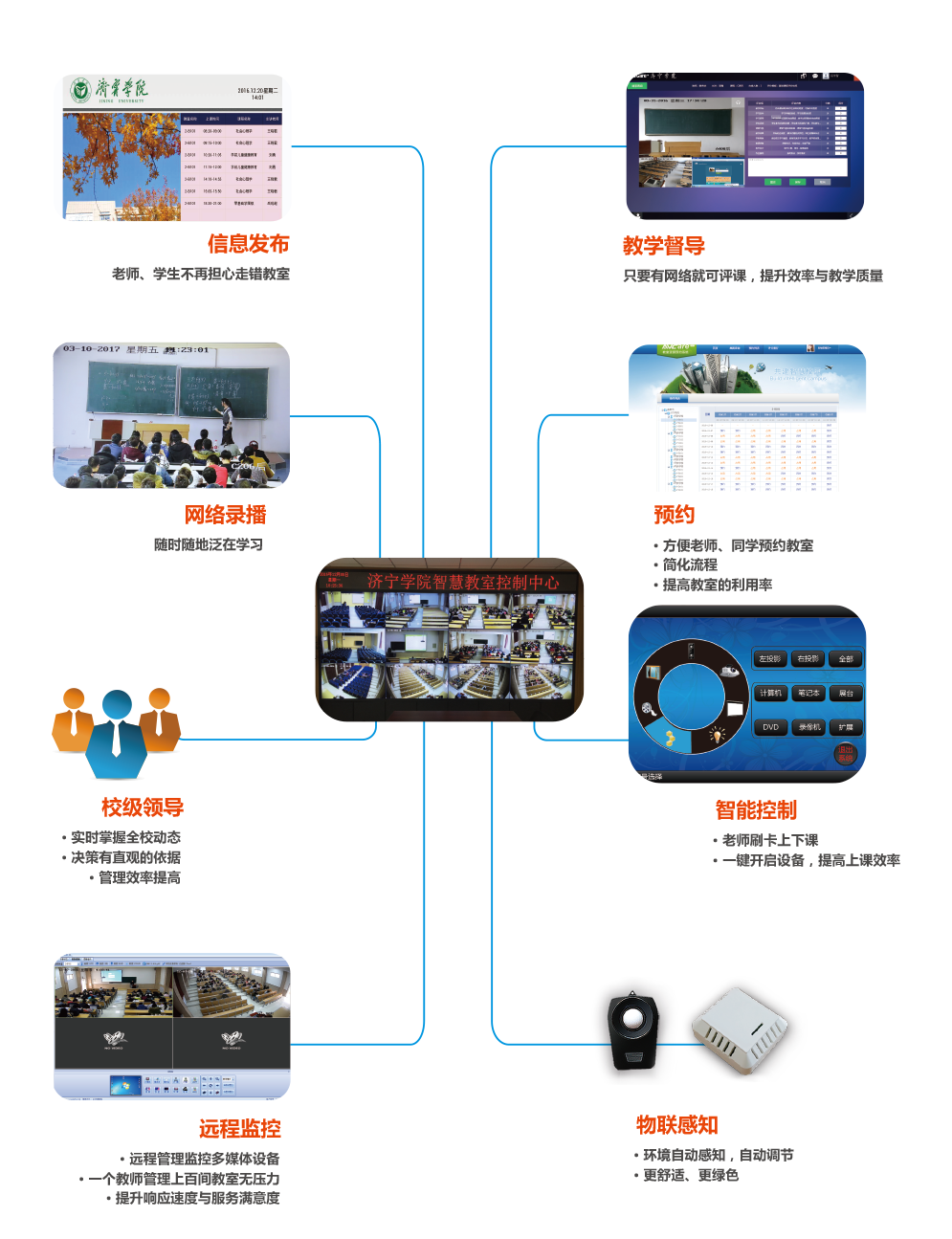 同方艾威康為學(xué)校打造了智慧教室整體解決方案,包含多媒體教學(xué)管理系統(tǒng)、物聯(lián)感知智慧環(huán)境控制系統(tǒng)、教學(xué)觀摩與評(píng)估系統(tǒng)、信息發(fā)布系統(tǒng)、教室預(yù)約系統(tǒng)、數(shù)字音頻廣播系統(tǒng)等,實(shí)現(xiàn)了如下功能: